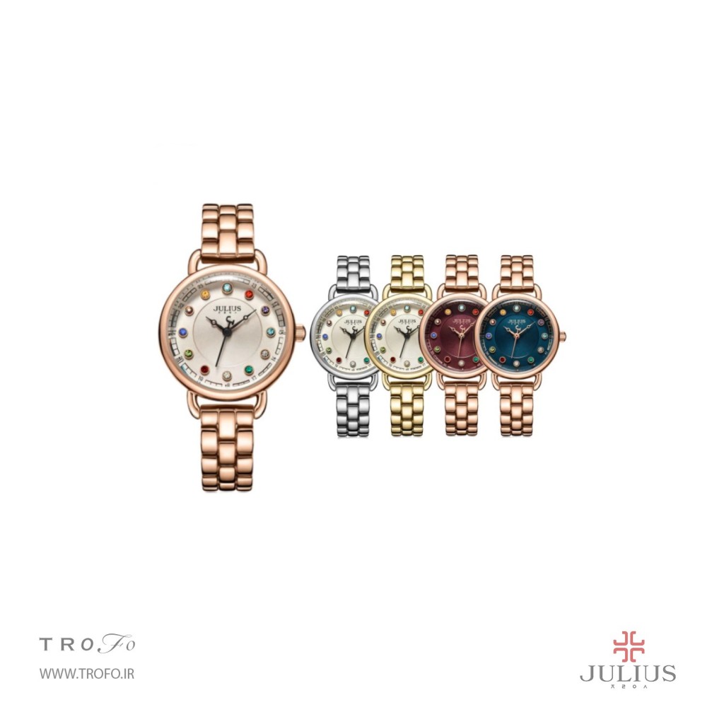 این مدل ساعت مچی عقربه ای زنانه از برند کره ای جولیوس ,ساعت تک موتوره، صفحهی ساعت گرد ۲۷ میلیمتری, تاج ساعت به رنگ رزگلد است, صفحه ساعت کرم و عقربه ها آن مشکی است و نمایش ساعت با نگین است و بندآن استیل است. این ساعت تا فشار ۳ATM (۳۰ متر) در برابر آب مقاوم است, ضخامت صفحه ۹ میلیمتر است,این ساعت زنانه کوارتز ژاپن بوده و منبع تامین انرژی آن باتری است, شیشه ساعت از نوع معدنی است.