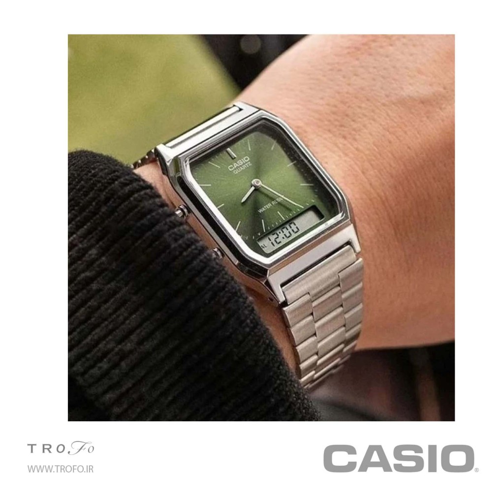 ساعت مچی کاسیو VINTAGE مدل AQ-230A-3AMQYDF یکی از مدلهای خاص و محبوب این برند ژاپنی است که با ترکیب نمایش آنالوگ و دیجیتال، طراحی کلاسیک و الهامگرفته از سبک وینتیج، انتخابی متفاوت برای علاقهمندان به ساعتهای نوستالژیک محسوب میشود. این مدل با صفحه سبز خاص و قاب مستطیلی، جلوهای منحصربهفرد به استایل روزمره و نیمهرسمی میبخشد.