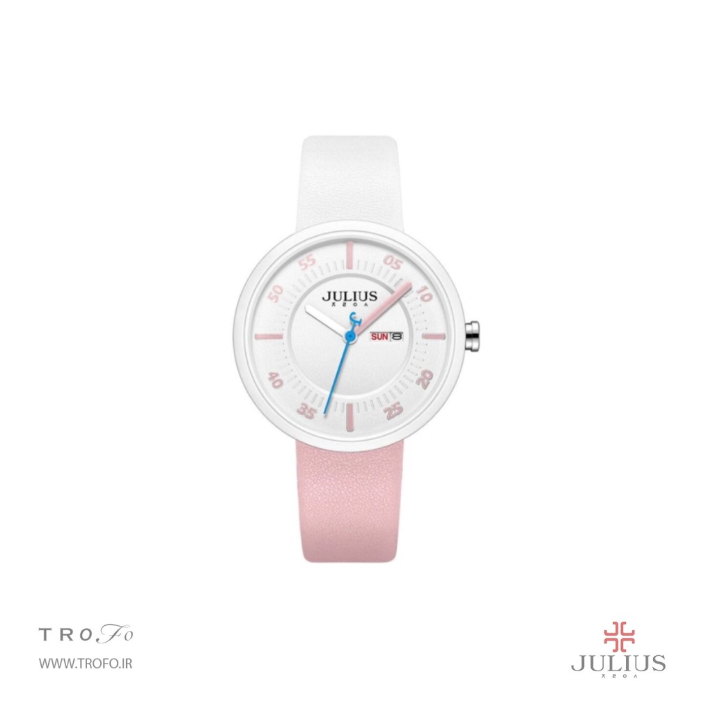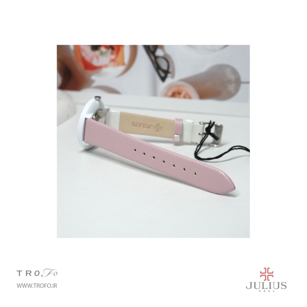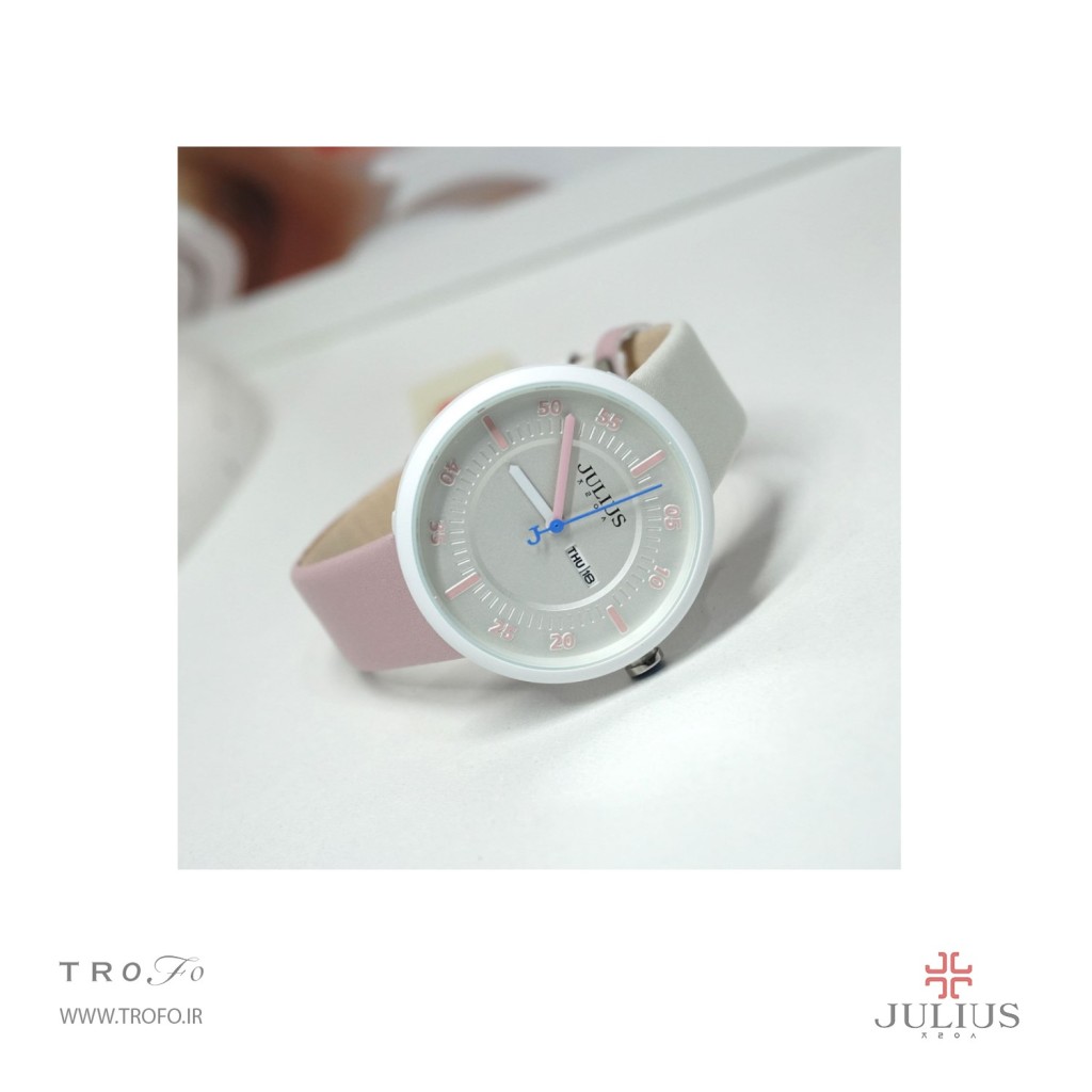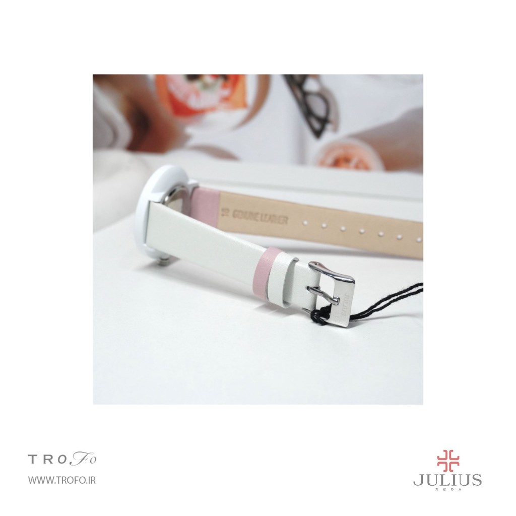 این مدل ساعت مچی عقربه ای زنانه از برند کره ای جولیوس ,ساعت تک موتوره، صفحهی ساعت گرد34 میلیمتری, تاج ساعت به رنگ نقره ای است, صفحه ساعت سفید و عقربه ها و نشان های ساعت صورتی است و بند آن چرم دو رنگ صورتی و سفید است. این ساعت تا فشار ۳ATM (۳۰ متر) در برابر آب مقاوم است, این ساعت زنانه کوارتز ژاپن بوده و منبع تامین انرژی آن باتری است, شیشه ساعت از نوع معدنی است.