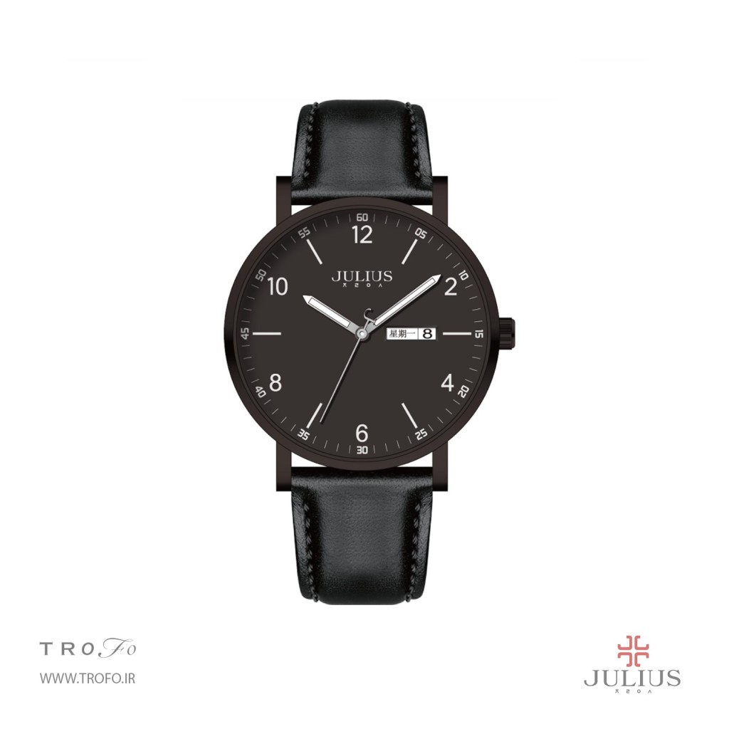 این مدل ساعت مچی عقربه ای مردانه از برند کره ای جولیوس ,ساعت تک موتوره، صفحهی ساعت گرد 40 میلیمتری, تاج ساعت به رنگ مشکی است, صفحه ساعت مشکی و عقربه ها و نشان های ساعت سفید است و بند آن چرم مشکی است. این ساعت تا فشار ۳ATM (۳۰ متر) در برابر آب مقاوم است, این ساعت زنانه کوارتز ژاپن بوده و منبع تامین انرژی آن باتری است, شیشه ساعت از نوع معدنی است.