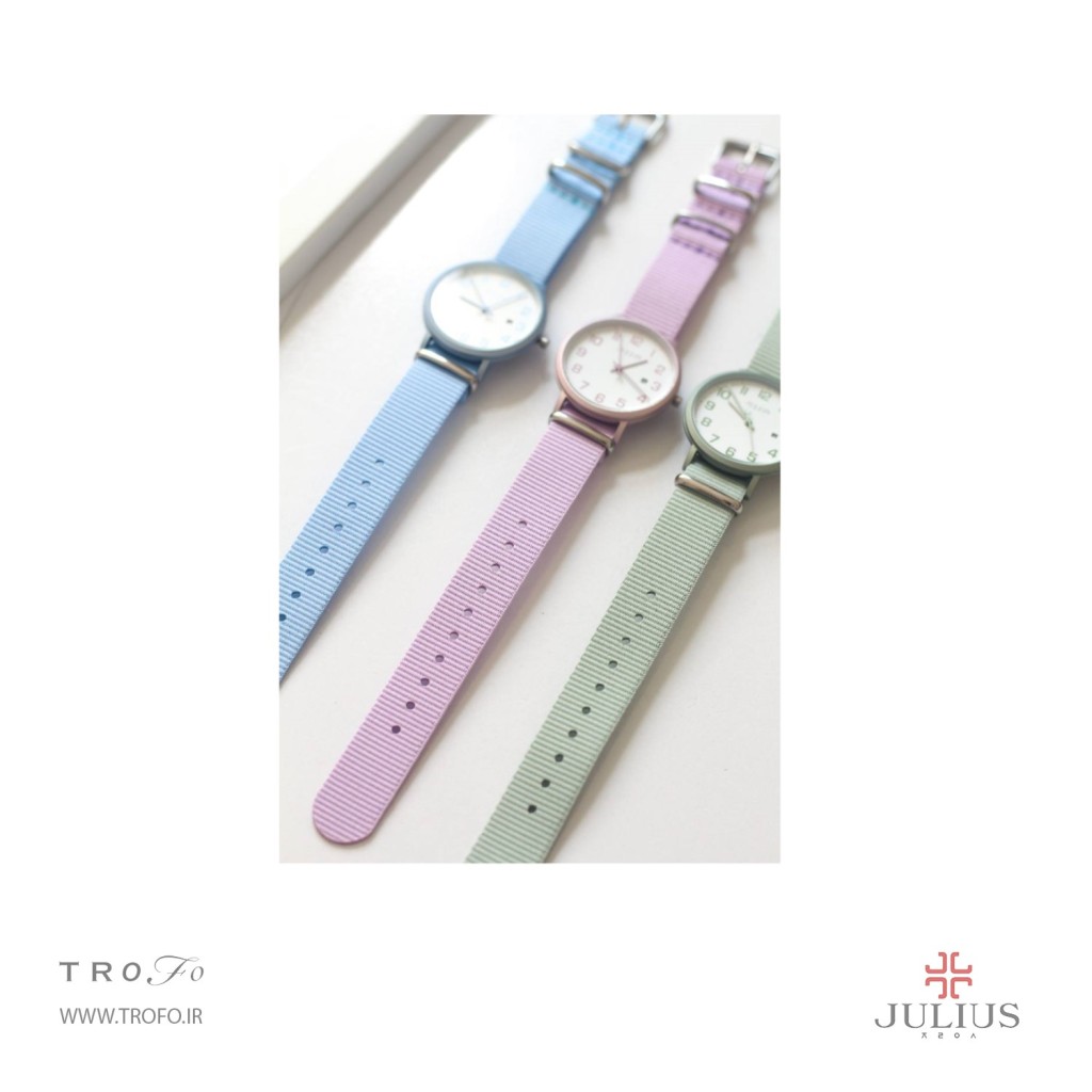 این مدل ساعت مچی عقربه ای زنانه از برند کره ای جولیوس ,ساعت تک موتوره، صفحهی ساعت گرد 34 میلیمتری, تاج ساعت به رنگ نقره ای است, صفحه ساعت سفید و عقربه ها و نشان های ساعت بنفش است و بند آن برزنتی بنفش است. این ساعت تا فشار ۳ATM (۳۰ متر) در برابر آب مقاوم است, این ساعت زنانه کوارتز ژاپن بوده و منبع تامین انرژی آن باتری است, شیشه ساعت از نوع معدنی است.